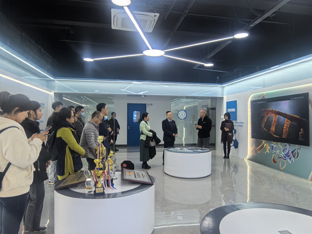 活動中,雙方分別介紹了支部的建設(shè)情況,并圍繞黨建活動、青年活動、科研項目、科研平臺、學(xué)術(shù)交流等展開交流。廣州健康院黨委書記、副院長段子淵表示,通過支部的合作共建,將進(jìn)一步推動基礎(chǔ)研究與臨床研究深度融合,加快健康院研究成果臨床轉(zhuǎn)化和應(yīng)用。廣醫(yī)五院副院長秦大江介紹了醫(yī)院的建設(shè)情況并分享其在廣州健康院工作的經(jīng)歷。他談到,廣州健康院和廣醫(yī)五院擁有良好的合作基礎(chǔ),相信通過支部合作,必能提升醫(yī)院的科研創(chuàng)新能力,助推高質(zhì)量發(fā)展。廣醫(yī)五院機(jī)關(guān)第三黨支部還參觀了廣州健康院科學(xué)家精神教育基地、分析測試中心和生物醫(yī)學(xué)數(shù)據(jù)和超算中心等。