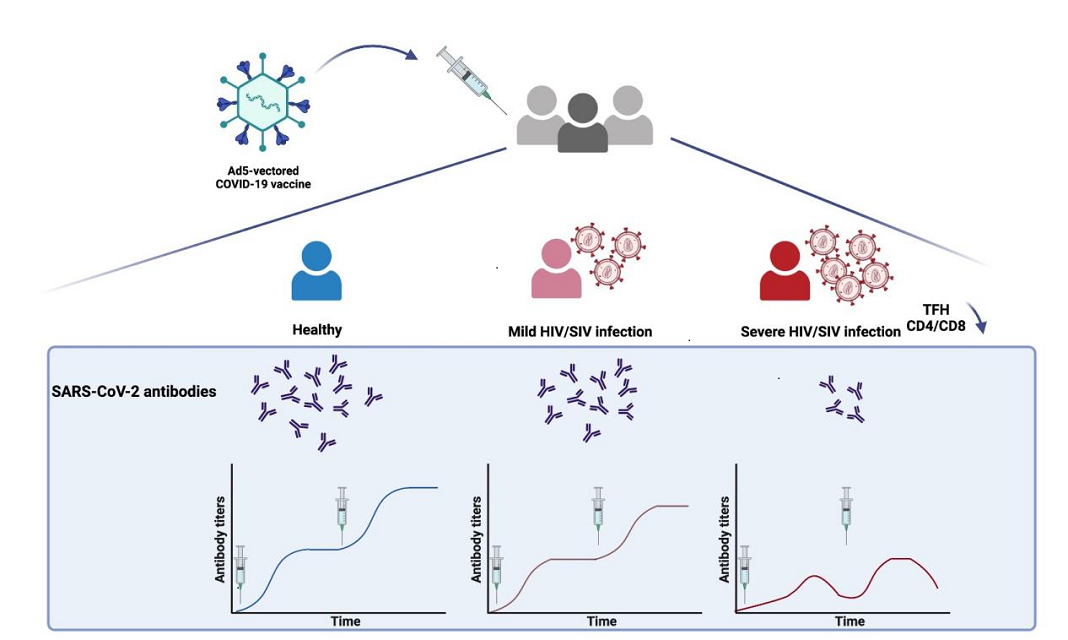 研究者基于2020年研制的腺病毒載體新冠疫苗,可在健康獼猴中誘導(dǎo)保護(hù)性免疫反應(yīng)(Nature Communications. 2020),利用感染猴艾滋病毒的獼猴模型來模擬輕度及重度免疫缺陷的艾滋病人群,研究該腺病毒載體新冠疫苗在艾滋獼猴體內(nèi)的免疫效果。研究發(fā)現(xiàn),單針接種新冠疫苗后,新冠疫苗在輕度免疫缺陷艾滋獼猴(病毒載量小于105 拷貝/毫升血漿)體內(nèi)誘導(dǎo)與健康獼猴相當(dāng)?shù)目贵w和細(xì)胞應(yīng)答,而重度免疫缺陷艾滋獼猴(病毒載量大于105 拷貝/毫升血漿)的抗體和細(xì)胞應(yīng)答的強(qiáng)度和持續(xù)時(shí)間則嚴(yán)重受損。兩針加強(qiáng)接種后,輕度免疫缺陷艾滋獼猴與健康獼猴的免疫應(yīng)答水平均迅速升高;同時(shí),70%的重度免疫缺陷艾滋獼猴的免疫應(yīng)答水平也迅速提升,但應(yīng)答水平持續(xù)較短。