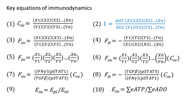 現(xiàn)代免疫學在多個學科不斷發(fā)展的支撐下正在蓬勃發(fā)展,涉及眾多理論和先進技術,如基因組學、轉錄組學、免疫組學、代謝組學和免疫代謝組學等,但其核心理論是免疫識別理論,涉及“自我”和“非我”的識別機制,天然免疫的模式識別機制和適應性免疫的T細胞和B細胞受體庫的生成和選擇機制。作者基于對免疫平衡理論的認識,通過系列化思辨和數(shù)理邏輯推導,建立了免疫動力學理論方程,包括了基于物質和信息流兩個方面 [圖中的方程(1)至(6)] 以及基于能量流的方程 [圖中的方程(9)和(10)]。通過方程的等價變換和對已發(fā)表功能數(shù)據(jù)的實際計算,利用曲線擬合和比較等,找到一組能夠代表理論方程的簡單而實用的近似方程,即免疫動力學實用方程 [圖中的方程(7)和(8)]。