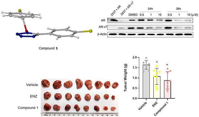 圖注:先導(dǎo)化合物Compound 1的結(jié)構(gòu)(左上);先導(dǎo)化合物Compound 1抑制22Rv1細(xì)胞AR和AR-V7的蛋白表達(dá)(右上);先導(dǎo)化合物Compound 1抑制22Rv1異種移植的去勢抵抗性前列腺癌小鼠腫瘤生長(下)