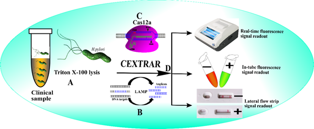 用于幽門螺旋桿菌實時熒光和比色監(jiān)測的CEXTRAR平臺工作示意圖