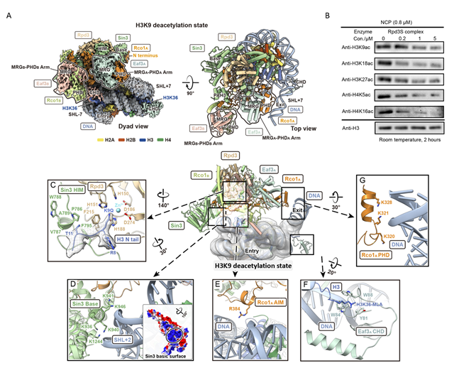 圖1. A:Rpd3S去乙酰化H3K9的cryo-EM電子密度圖及搭建模型圖;B:Rpd3S去乙?;?/font>H3/H4不同賴氨酸殘基的western blotting結(jié)果;C:H3 N端K9Q與Rpd3的酶活中心相互作用圖;D:Sin3 basic surface氨基酸與DNA相互作用圖;E:Rco1 AIM與DNA相互作用圖;F:CHD芳香籠與H3K36me3相互作用圖;G:Rco1 PHD與DNA相互作用圖。