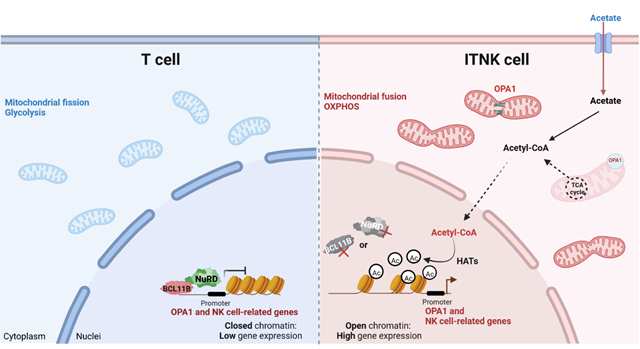 細(xì)胞代謝可影響T細(xì)胞的分化狀態(tài)和功能。本研究發(fā)現(xiàn),在T細(xì)胞中BCL11B可直接結(jié)合在線粒體內(nèi)膜融合蛋白視神經(jīng)萎縮1(optic atrophy1,OPA1)基因的TSS區(qū)并抑制其轉(zhuǎn)錄,敲除BCL11B可上調(diào)表達(dá)OPA1并介導(dǎo)線粒體融合。融合線粒體促進(jìn)了ITNK細(xì)胞氧化磷酸化(OXPHOS)代謝水平,進(jìn)而促進(jìn)ITNK細(xì)胞重編程效率和抗腫瘤活性。代謝產(chǎn)物不僅可以作為代謝信號(hào)調(diào)控細(xì)胞生物大分子合成為細(xì)胞提供物質(zhì)和能量,還可作為非代謝信號(hào),通過(guò)組蛋白或DNA表觀修飾調(diào)控基因表達(dá)。本研究進(jìn)一步發(fā)現(xiàn)ITNK細(xì)胞OXPHOS代謝增強(qiáng)乙酰-CoA水平,高濃度的乙酰-CoA作為組蛋白乙?;牡孜?/span>,通過(guò)增加NK相關(guān)基因及細(xì)胞毒性相關(guān)基因位點(diǎn)的H3K27乙?;?/span>修飾,促進(jìn)相關(guān)基因的表達(dá),提升ITNK細(xì)胞的抗腫瘤活性。