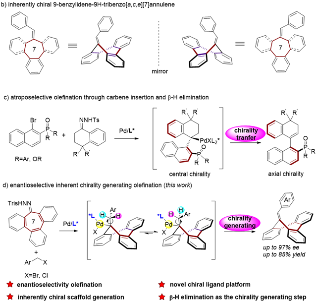 在過(guò)去的幾十年里,人們對(duì)中心手性、軸向手性、平面手性和螺旋手性的研究非常深入,取得了許多優(yōu)異的成果。但是,人們對(duì)固有手性分子的手性特征,不對(duì)稱合成研究,以及它們?cè)谏锘钚约肮鈱W(xué)材料等方面的應(yīng)用卻遠(yuǎn)遠(yuǎn)落后。這是因?yàn)楣逃惺中?/span>中環(huán)分子的非平面但穩(wěn)定的構(gòu)象通常被忽略,它們被常常視為非手性的平面分子;或者即使認(rèn)為它們具有非平面的構(gòu)象,也認(rèn)為這些構(gòu)象是動(dòng)態(tài)的,不穩(wěn)定的。朱強(qiáng)/羅爽團(tuán)隊(duì)在成功實(shí)現(xiàn)兩類氮雜八元環(huán)固有手性化合物的不對(duì)稱合成以后,再次實(shí)現(xiàn)了對(duì)更具挑戰(zhàn)性的全碳七元環(huán),即固有手性三苯并輪烯衍生物的不對(duì)稱合成。在這項(xiàng)研究中,研究人員通過(guò)鈀催化的七元環(huán)腙衍生物為卡賓前體與芐基溴進(jìn)行反應(yīng),在溫和的條件下,高產(chǎn)率、優(yōu)異對(duì)映選擇性地合成了多種固有手性的三苯并輪烯衍生物。密度泛函理論計(jì)算揭示了在這一過(guò)程中決定立體化學(xué)的步驟是通過(guò)卡賓遷移插入和 -氫消除形成外環(huán)雙鍵,通過(guò)不對(duì)稱的 -氫消除來(lái)控制產(chǎn)物的手性。這種只通過(guò) -氫消除而產(chǎn)生手性的例子非常罕見(圖2)。同時(shí),研究人員發(fā)現(xiàn)從其中一個(gè)固有手性產(chǎn)物衍生出的手性膦配體1在不對(duì)稱的Tsuji-Trost反應(yīng)和1,4-加成反應(yīng)中表現(xiàn)出卓越的催化性能,表明固有手性的三苯并輪烯衍生物是設(shè)計(jì)新手性配體和催化劑的優(yōu)秀骨架(圖3)。再次證明了長(zhǎng)期被忽視的固有手性可以在不對(duì)稱合成乃至更多的領(lǐng)域大有可為。