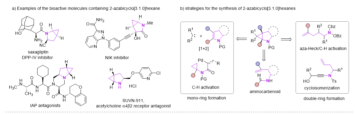 2-氮雜雙環(huán)[3.1.0]己烷骨架因其獨(dú)特的結(jié)構(gòu)優(yōu)勢(shì),廣泛應(yīng)用在藥物分子、生物活性分子以及有機(jī)合成領(lǐng)域,其中三元環(huán)的存在可以降低分子的親脂性以及調(diào)節(jié)N-中心的堿性。目前這類骨架的合成主要方法有Simmons-Smith環(huán)丙烷化、Kulinkovich環(huán)丙烷化、鈀催化分子內(nèi)碳?xì)浠罨?、以及分子?nèi)環(huán)異構(gòu)化實(shí)現(xiàn)。但這些多數(shù)都集中在其消旋體的構(gòu)建,以及N上通常需要保護(hù)。