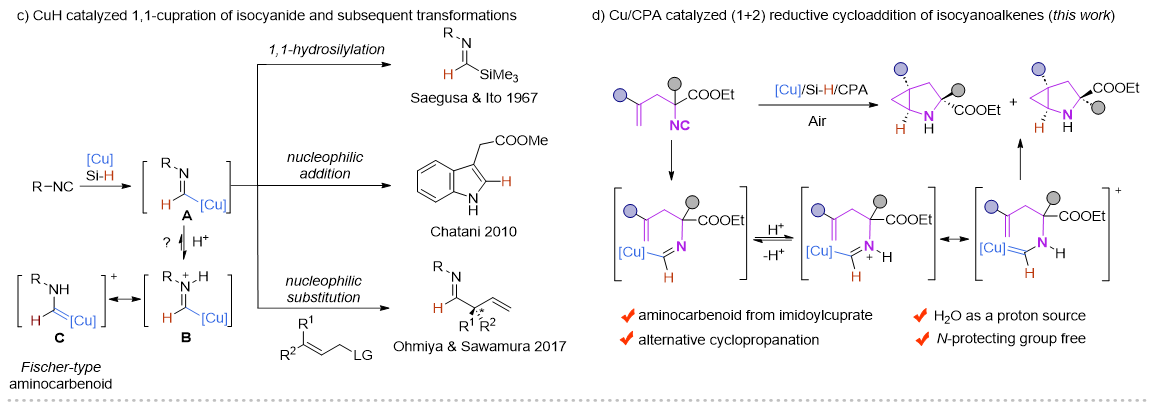 近年來,Cu-H催化的烯烴的1,2-氫官能化反應(yīng)取得了飛速的發(fā)展,尤其是在對(duì)映選擇性氫胺基化領(lǐng)域,Buchwald課題組做了開創(chuàng)性且系統(tǒng)性的工作 (Acc. Chem. Res. 2020,53,1229?1243)。但與此形成鮮明對(duì)比的是,Cu-H催化的異腈的1,1-氫官能化反應(yīng)模式相對(duì)單一,這主要是由于形成的甲酰亞胺銅中間體是親核性的,只能發(fā)生親核取代和親核加成反應(yīng)。在此前的報(bào)道中,一些過渡金屬諸如Ni,Co,很容易與異腈配位形成亞胺金屬絡(luò)合物。在酸性條件下,這類物種更傾向于異構(gòu)形成一類新型的氨基金屬卡賓(Organometallics.,2003,22,2817?2819;Organometallics.,2021,40,968?978),但這類物種活性尚未被廣泛研究。