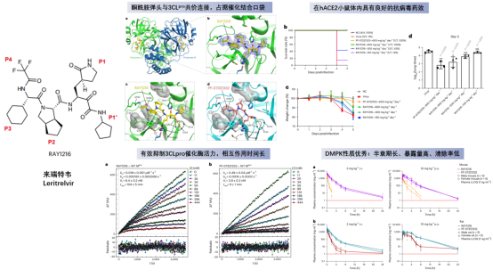 研究揭示RAY1216在體內(nèi)外的抗病毒實驗中表現(xiàn)出與輝瑞奈瑪特韋(Nirmatrelvir (PF-07321332)相當(dāng)水平的抗病毒藥效。RAY1216對SARS-CoV-2多種變異株均顯示出良好的抗病毒活性,半數(shù)效應(yīng)劑量(EC50)均處于納摩爾級別,能夠有效抑制多種新冠變異株在Vero E6細胞中的增殖復(fù)制,顯著降低病毒滴度水平。在K18-hACE2轉(zhuǎn)基因小鼠模型中,來瑞特韋的治療不僅有效地提高感染小鼠的生存保護率,也顯著降低了其肺部病毒載量,減緩了由病毒感染導(dǎo)致的體重減輕,改善了感染肺損傷病理變化的表征。研究還利用復(fù)制子方法驗證了RAY1216對于目前對PF-07321332強耐藥的主蛋白酶突變體L50F+E166V仍然保持一定的抑制作用(EC50=233±4 nM)。