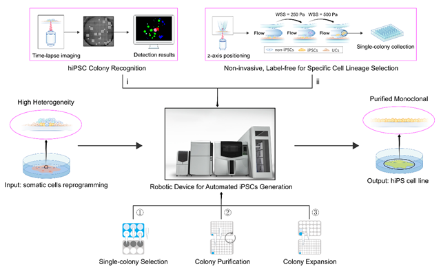 近日,中國(guó)科學(xué)院廣州生物醫(yī)藥與健康研究院(廣州健康院)張驍研究員團(tuán)隊(duì)提出一種基于結(jié)構(gòu)微流體創(chuàng)新的譜系細(xì)胞單克隆自動(dòng)化獲取策略,以無(wú)標(biāo)記、無(wú)酶活反應(yīng)參與、非侵入式的方式,在體細(xì)胞重編程過(guò)程出現(xiàn)的復(fù)雜譜系中實(shí)現(xiàn)了對(duì)特定譜系的單克隆性細(xì)胞的自動(dòng)化獲取,并研發(fā)出基于結(jié)構(gòu)微流體的細(xì)胞單克隆獲取整機(jī)技術(shù)(圖1)。該原創(chuàng)性策略被部署于廣州健康院前期自主研發(fā)的自動(dòng)化干細(xì)胞誘導(dǎo)培養(yǎng)裝備,提高了人誘導(dǎo)多能干細(xì)胞(hiPSCs)單克隆的獲取效率與純度,提升了系統(tǒng)魯棒性(robustness)及縮短了體細(xì)胞重編程后持續(xù)純化hiPSCs(sub-cloning)的建系周期。相關(guān)研究成果以“Selecting Monoclonal Cell Lineages from Somatic Reprogramming Using Robotic-Based Spatial-Restricting Structured Flow”為題在國(guó)際權(quán)威學(xué)術(shù)期刊?Research?上在線發(fā)表。