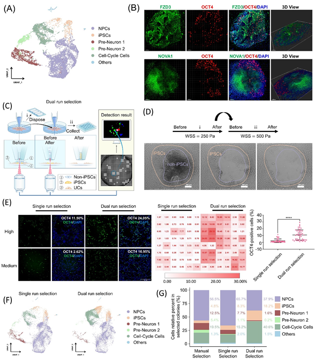 此外,作者團(tuán)隊(duì)借助自動(dòng)化整機(jī)技術(shù)的精確的流體操控能力,設(shè)計(jì)了一種雙挑模式(Dual?Run?Selection),通過(guò)使用兩次不同強(qiáng)度的剪切流體分別獲取不同類型粘附特性的譜系細(xì)胞,實(shí)現(xiàn)了對(duì)特定空間位置的hiPSCs譜系細(xì)胞單克隆的特異性選擇(圖3),并能為下游hiPSCs實(shí)現(xiàn)特異性擴(kuò)增提供純化(sub-cloning)能力。