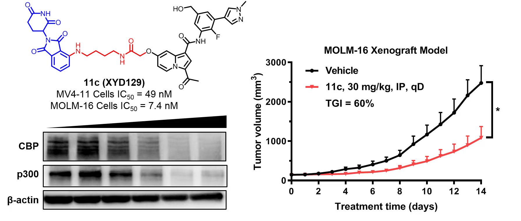 通過(guò)系統(tǒng)的構(gòu)效關(guān)系研究和生物活性評(píng)價(jià),最終發(fā)現(xiàn)高活性的CBP/p300降解劑XYD129(圖2)。該降解劑能有效結(jié)合CBP/p300和CRBN,并形成穩(wěn)定的三元復(fù)合物。XYD129可抑制AML細(xì)胞系MV4-11和MOLM-16的增殖(IC50分別為49 nM和7.4?nM),并通過(guò)蛋白酶體途徑降解CBP和p300蛋白(圖2)。在MOLM-16小鼠異種移植瘤模型中,XYD129可顯著抑制小鼠體內(nèi)腫瘤的生長(zhǎng)(TGI = 60%)(圖2)。本研究為AML的治療提供了新的候選藥物。