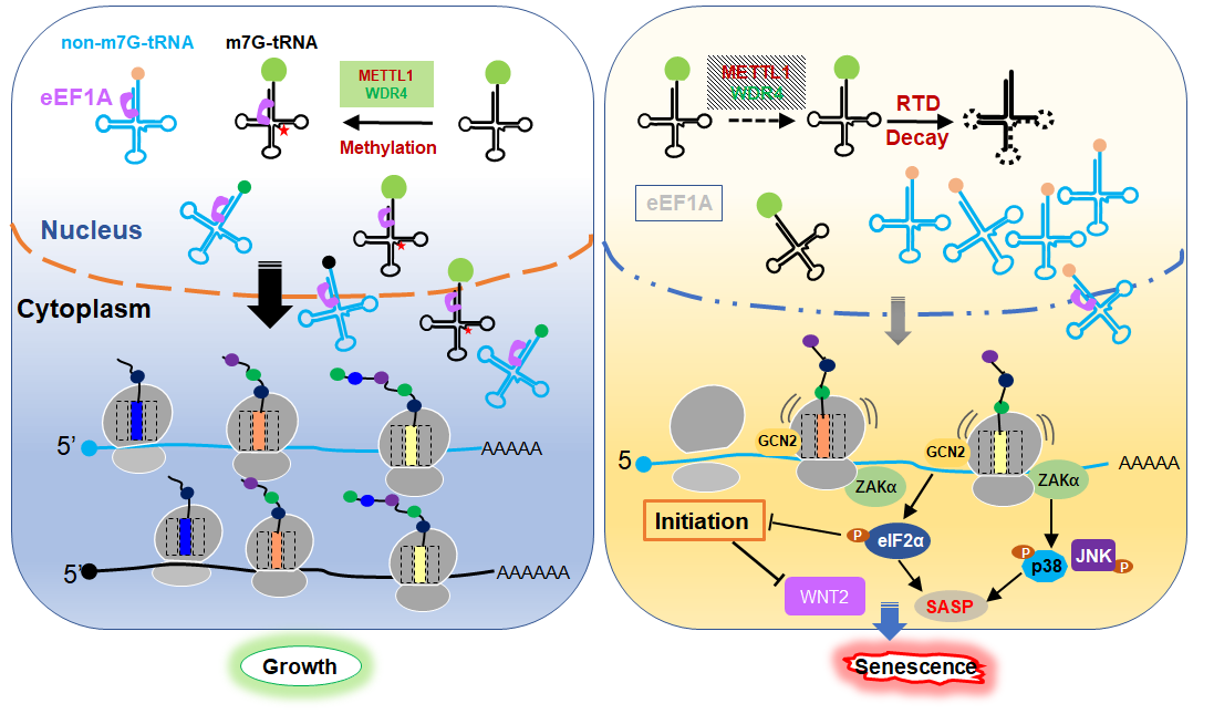 近日,中國科學(xué)院廣州生物醫(yī)藥與健康研究院的王濤課題組與王杰課題組合作在Nature Communications雜志發(fā)表了題為“Perturbation of METTL1-mediated tRNA N7- methylguanosine modification induces senescence and aging”的研究成果。該研究揭示了METTL1/WDR4介導(dǎo)的tRNA-m7G修飾對于維持衰老過程中蛋白質(zhì)組穩(wěn)態(tài)的重要作用,研究結(jié)果闡明了tRNA修飾對于衰老的調(diào)控作用。