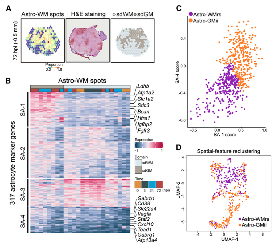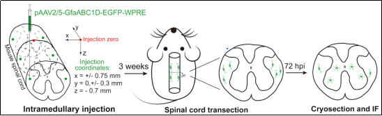通過 SA-CCC細(xì)胞互作網(wǎng)絡(luò)分析,研究人員發(fā)現(xiàn)了一類在SCI后從脊髓白質(zhì)遷移到脊髓灰質(zhì)的星型膠質(zhì)細(xì)胞亞群(圖1C)。接著通過脊髓實(shí)質(zhì)注射和lineage tracing實(shí)驗(yàn),證實(shí)了SCI后這類由白質(zhì)向灰質(zhì)定向遷移的星型膠質(zhì)細(xì)胞亞群的存在及其細(xì)胞來源(圖3),該團(tuán)隊(duì)將其命名為“injury-induced, gray matter-relocated astrocytes (Astro-GMii)”。
