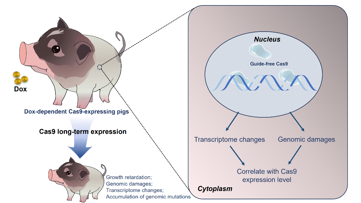近日,中國(guó)科學(xué)院廣州生物醫(yī)藥與健康研究院賴良學(xué)/王可品課題組在Signal Transduction and Targeted Therapy雜志上發(fā)表了題為In vivo evaluation of guide-free Cas9-induced safety risks in a pig model的研究論文。該研究發(fā)現(xiàn),Cas9蛋白本身在豬體內(nèi)持續(xù)性表達(dá)會(huì)導(dǎo)致體內(nèi)基因組損傷、轉(zhuǎn)錄組穩(wěn)態(tài)改變和全基因組突變?cè)黾樱瑥亩l(fā)安全風(fēng)險(xiǎn)。