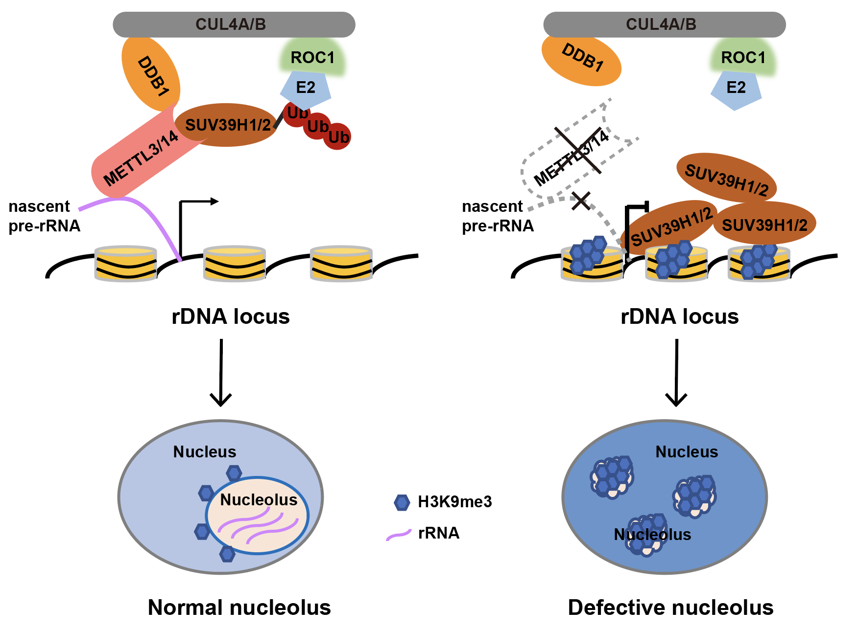此項研究發(fā)現(xiàn)在人胚胎干細(xì)胞中敲除METTL3或METTL14后,并沒有導(dǎo)致傳統(tǒng)認(rèn)為的mRNA變化,而是引起核仁結(jié)構(gòu)和功能的劇烈異常,包括核仁變小、數(shù)目異常增多、rRNA合成減少、核糖體裝配障礙、核仁功能異常導(dǎo)致的核仁應(yīng)激導(dǎo)致的細(xì)胞生長停滯等。進一步發(fā)現(xiàn),缺失METTL3或METTL14后,徹底破壞了核仁的液-液相分離,從而核仁不能形成完整且規(guī)則的由多種大分子相分離形成的正常多層級聚集體結(jié)構(gòu)。隨后,研究發(fā)現(xiàn)在METTL3/METTL14缺陷的細(xì)胞中,H3K9me3甲基轉(zhuǎn)移酶SUV39H1/H2蛋白顯著升高,導(dǎo)致H3K9me3在整個核仁中積累和浸潤,并損害LLPS。從機制上說,METTL3/METTL14復(fù)合物作為CRL4 E3泛素連接酶的必要接頭,靶向SUV39H1/H2并促進其多泛素化和蛋白酶體降解,從而阻止H3K9me3在核仁中的積累,并維持其正常的LLPS和結(jié)構(gòu)。