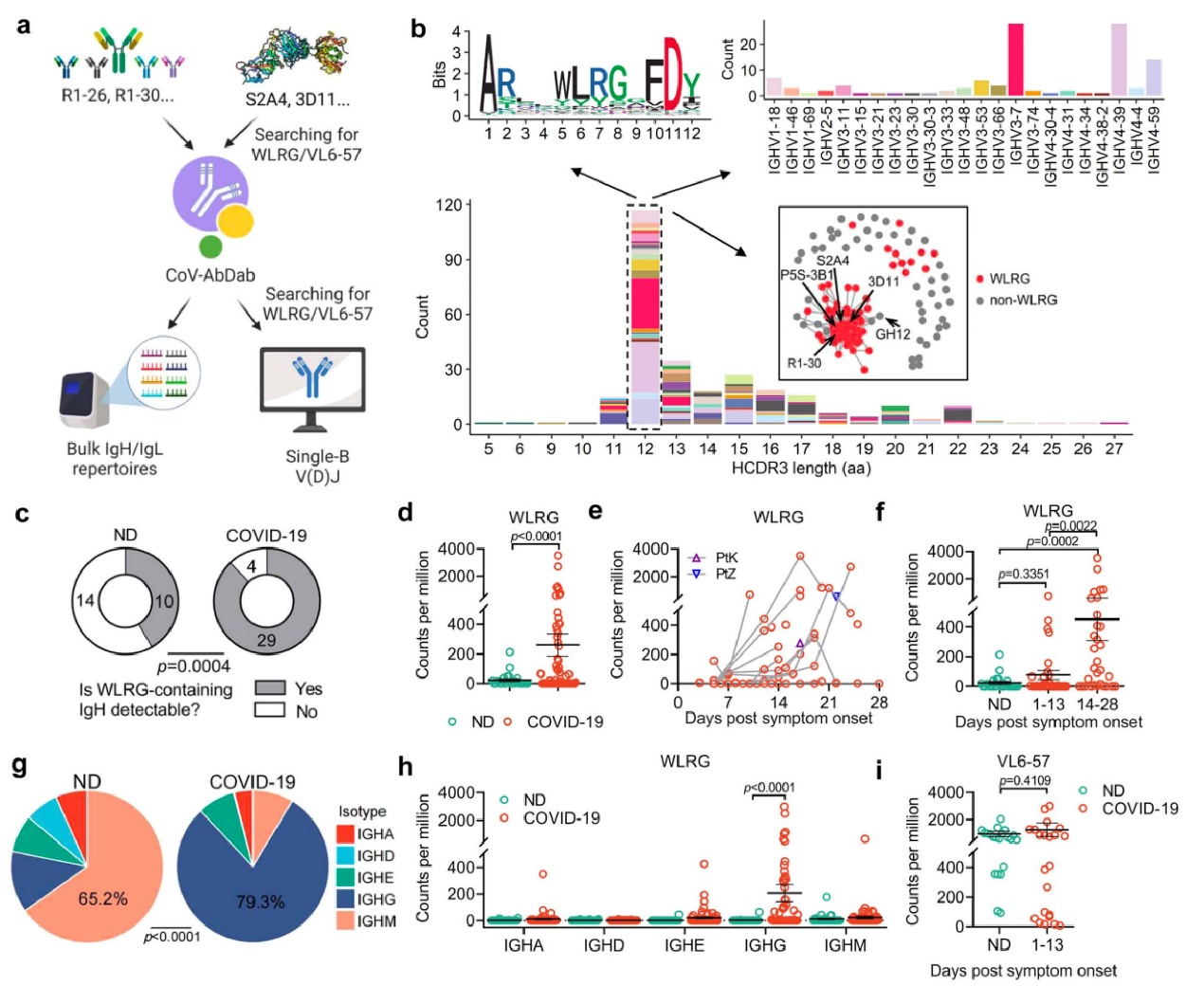 比對R1-26的結構,蛋白數據庫(PDB)分析發(fā)現,近10個結構已解析的4類抗體的輕鏈均由VL6-57編碼。這些VL6-57抗體通過相似的HCDR3疏水性基序和LCDR1的“NY”基序與RBD上371-373-375位點定義的趨同表位相互作用。冠狀病毒抗體數據庫(CoV-AbDab)分析顯示,VL6-57抗體的HCDR3富含“WLRG”基序,LCDR3富含“QSYDSS”基序。進一步的抗體組庫分析發(fā)現,含“WLRG”基序的IgH序列在新冠感染和健康人群中均存在,但在感染后顯著擴增并發(fā)生類別轉換,而含“QSYDSS”基序的VL6-57輕鏈在兩組中的表達水平相當。這些結果表明,在新冠病毒刺激下,表達VL6-57抗體的na?veB細胞被激活并發(fā)生克隆擴增和類別轉換,在近90%的新冠感染者中誘導了VL6-57類人群抗體。