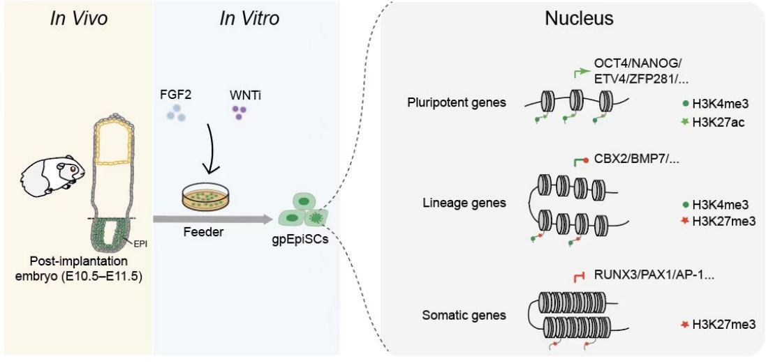 在該項研究中,研究團(tuán)隊從豚鼠植入后胚胎中成功分離培養(yǎng)出始發(fā)態(tài)多能干細(xì)胞系gpEpiSCs。這些細(xì)胞系在優(yōu)化后的培養(yǎng)基中能穩(wěn)定傳代并維持多能性,表達(dá)OCT4、SOX2和NANOG等關(guān)鍵多能性標(biāo)志物,能夠形成具有三個胚層細(xì)胞類型的畸胎瘤,核型穩(wěn)定。在信號調(diào)控上,F(xiàn)GF2、ACTIVIN A和WNT信號通路在維持gpEpiSCs多能性和抑制分化中起關(guān)鍵作用。對轉(zhuǎn)錄組和表觀遺傳組測序分析顯示,gpEpiSCs在與人類和嚙齒動物的始發(fā)態(tài)多能干細(xì)胞高度相似的同時也表現(xiàn)出獨特的基因表達(dá)譜,提供了新的物種特異性多能機(jī)制見解。