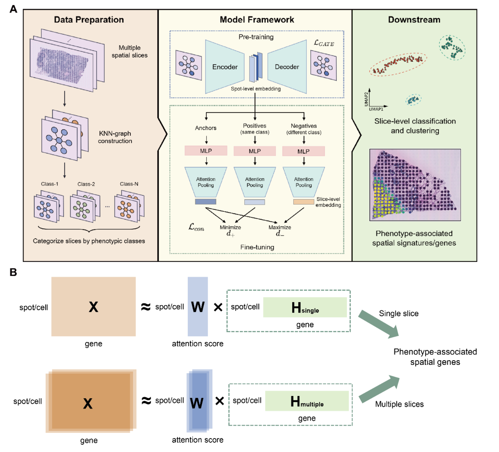 當(dāng)前的一些計(jì)算方法主要關(guān)注于單個(gè)或數(shù)個(gè)切片中細(xì)胞級(jí)別特征,對(duì)大量空間轉(zhuǎn)錄組學(xué)切片數(shù)據(jù)處理的效能不足。有別于此,PASSAGE提出基于多層次注意力的大規(guī)模異構(gòu)空間組學(xué)表征方法,從空間組切片(slice)、細(xì)胞與分子多個(gè)層次進(jìn)行不同粒度的表征學(xué)習(xí)與解析,有效增強(qiáng)了計(jì)算效率和可擴(kuò)展性。具體來(lái)說(shuō),PASSAGE在基于圖注意力自編碼器的細(xì)胞級(jí)表征基礎(chǔ)上設(shè)計(jì)了注意池化層(attention pooling layer),將同一切片的所有細(xì)胞加權(quán)融合成切片級(jí)表征,而后通過由表型信息指導(dǎo)的對(duì)比學(xué)習(xí)策略對(duì)切片級(jí)表征進(jìn)行優(yōu)化,并進(jìn)而采用非負(fù)矩陣分解方法獲得基因級(jí)別的注意力分?jǐn)?shù),從而實(shí)現(xiàn)對(duì)特定表型關(guān)聯(lián)空間組學(xué)特征的有效解析(圖1)。