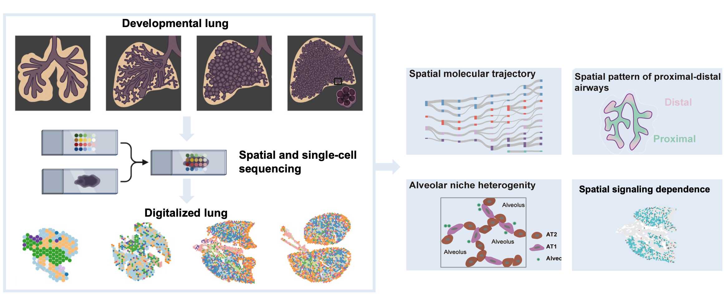 分子軌跡、近端和遠端氣道發(fā)育的空間模式、肺泡發(fā)育的生態(tài)位異質性和肺發(fā)育中的信號通路調控。