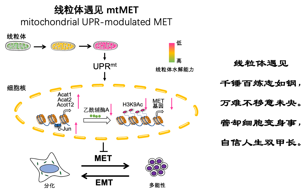 4月9日,中國科學(xué)院廣州生物醫(yī)藥與健康研究院劉興國團隊與廣州醫(yī)科大學(xué)應(yīng)仲富團隊在Nature Metabolism期刊上發(fā)表了一篇題為The mitochondrial unfolded protein response inhibits pluripotency acquisition and mesenchymal-to-epithelial transition in somatic cell reprogramming的文章。揭示了線粒體未折疊蛋白反應(yīng)(Mitochondrial unfolded protein response, UPRmt)在多能干細胞命運中通過c-Jun調(diào)控組蛋白乙酰化,進而影響間充質(zhì)-上皮轉(zhuǎn)化(MET)的新模式(mitochondrial UPR-modulated MET,mtMET)。這一模式的英文縮寫MET是“遇見”的過去式,因此將這一新模式稱為“線粒體遇見”。該研究進一步擴展了線粒體反向調(diào)控細胞核并調(diào)控細胞命運的研究領(lǐng)域。此外,團隊證明 UPRmt通過增強上皮-間充質(zhì)轉(zhuǎn)化 (EMT)促進腫瘤遷移和侵襲,揭示了腫瘤治療的潛在新靶點。