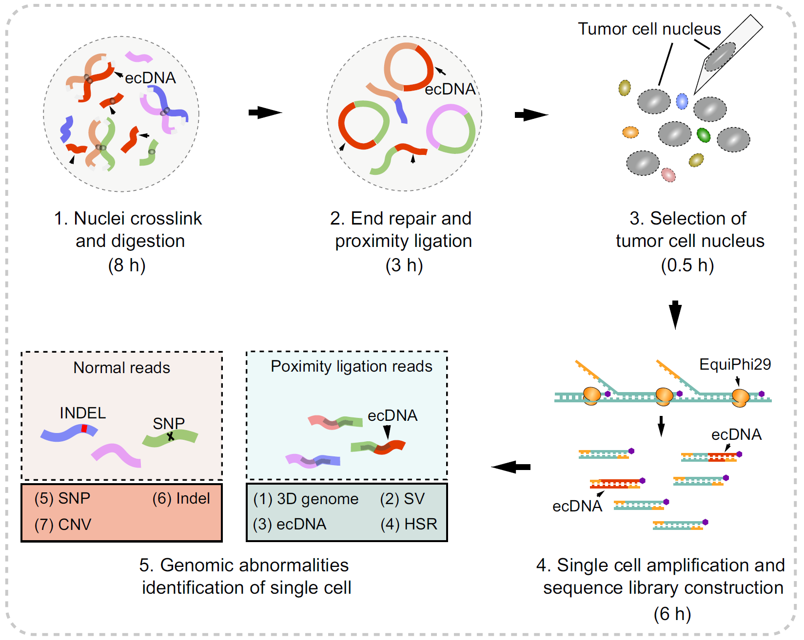 研究團隊利用Uni-C技術(shù)對胰腺癌來源的CTCs進行分析,僅整合7個細胞數(shù)據(jù),即可還原約89%的SNP/INDEL與75%的結(jié)構(gòu)變異,與腫瘤組織檢測結(jié)果高度一致,驗證了該方法在稀有細胞中的準(zhǔn)確性與代表性。進一步分析發(fā)現(xiàn),Uni-C可解析CTC中ecDNA的分子結(jié)構(gòu),以及處于細胞周期不同階段CTC所展現(xiàn)出的染色質(zhì)構(gòu)象差異,如A/B隔室重構(gòu)與高階結(jié)構(gòu)消失等,為評估CTC活性與細胞狀態(tài)提供了新維度。