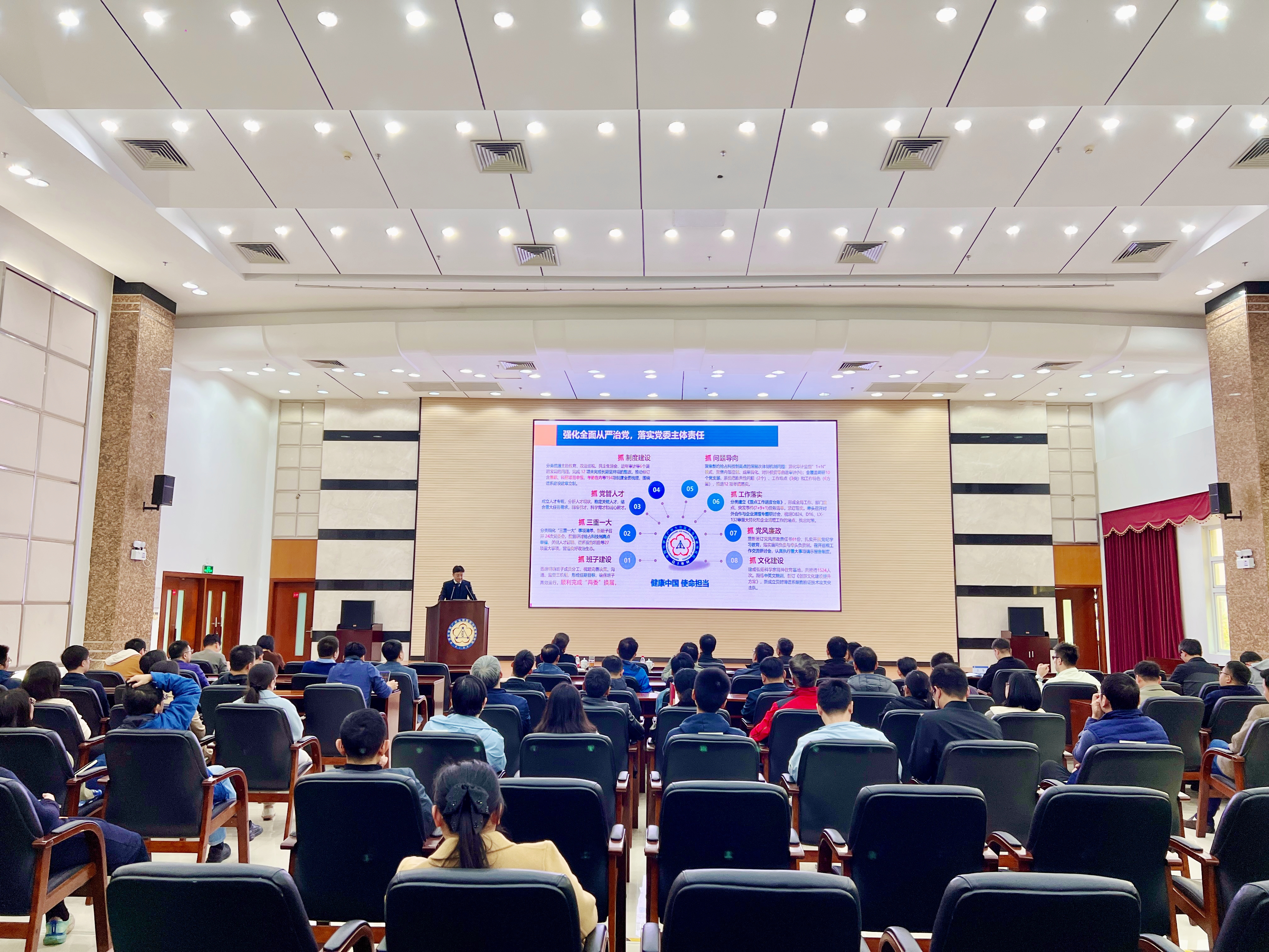 陳廣浩首先介紹了考核評(píng)議的要求和相關(guān)注意事項(xiàng)。隨后,孫飛副院長(zhǎng)(主持工作)代表廣州健康院領(lǐng)導(dǎo)班子作年度工作總結(jié)報(bào)告。孫飛從“強(qiáng)化全面從嚴(yán)治黨,以高質(zhì)量黨建引領(lǐng)高水平科技創(chuàng)新”“進(jìn)一步全面深化改革創(chuàng)新,提升研究院治理能力”“爭(zhēng)取重大科技任務(wù),保障創(chuàng)新成果產(chǎn)出”“匯聚優(yōu)勢(shì)力量,加快建設(shè)細(xì)胞譜系設(shè)施”“促進(jìn)科教融合,切實(shí)提升研究生培養(yǎng)質(zhì)量”“務(wù)實(shí)開(kāi)展交流合作,有效增強(qiáng)研究院國(guó)際影響力”等6個(gè)方面全面回顧了研究院2024年取得的成績(jī),分析了存在的問(wèn)題與不足,并對(duì)研究院2025年度重點(diǎn)工作進(jìn)行了部署。