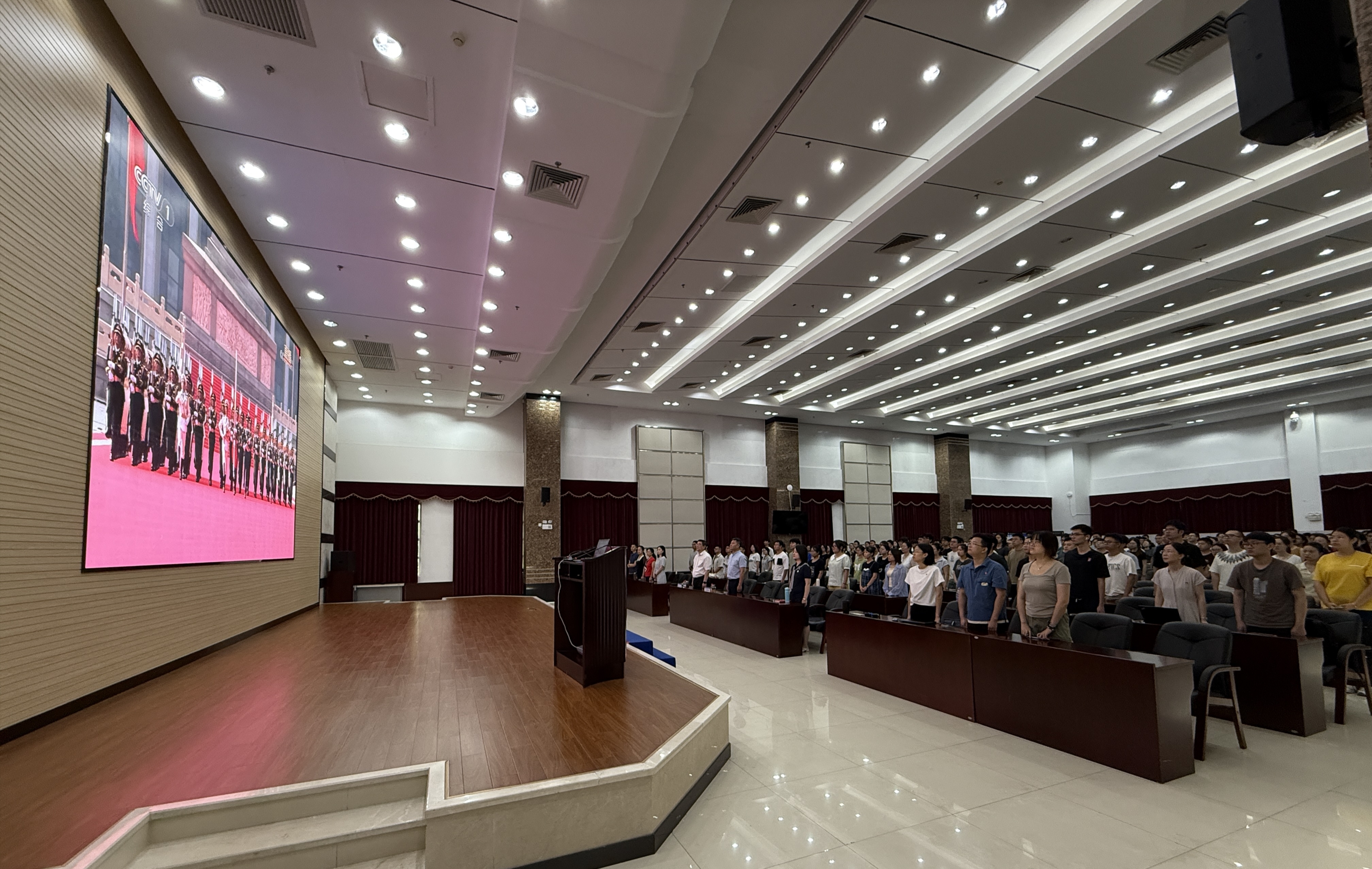 觀看現(xiàn)場座無虛席。大會伊始,全體人員肅立,行注目禮,高唱國歌,氣氛莊嚴(yán)肅穆。習(xí)近平總書記的重要講話深刻回顧了抗戰(zhàn)歷史,強調(diào)了偉大抗戰(zhàn)精神的時代意義,令人深思、催人奮進。隨后的徒步方隊、戰(zhàn)旗方隊、裝備方隊和空中梯隊依次亮相,展現(xiàn)出強大的國防力量,進一步激發(fā)了師生們的民族自豪感和愛國熱情。