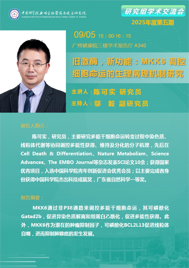 2025年5月9日研究組學(xué)術(shù)交流會(huì)(2025年度第五期):舊激酶,新功能:MKK6 調(diào)控細(xì)胞命運(yùn)的生理病理機(jī)制研究